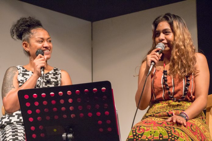 Feature Pic: Indigenous Australian singer, Emily Wurramara (right) and Papua New Guinea’s very own, Mereani Masani singing at a youth workshop last year.