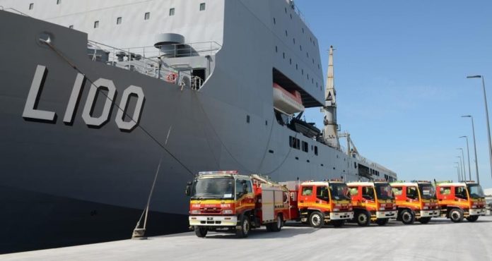 Five fire trucks are on the way to Papua New Guinea (PNG) on board HMAS Choules after being donated by the Queensland Fire and Emergency Service (QFES).