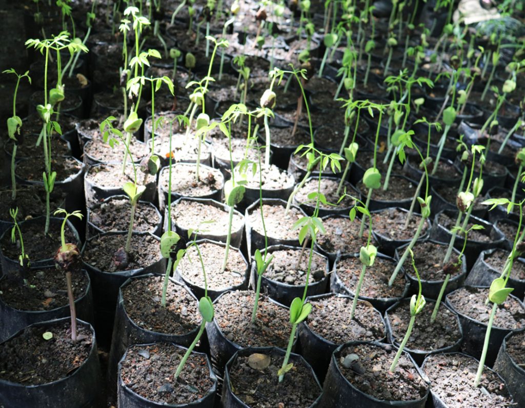 Port Moresby Nature Park’s Nursery Team Leader, Junior Muli, holding up a tray of germinated ‘Kwila’ seeds in its cotyledon stage.