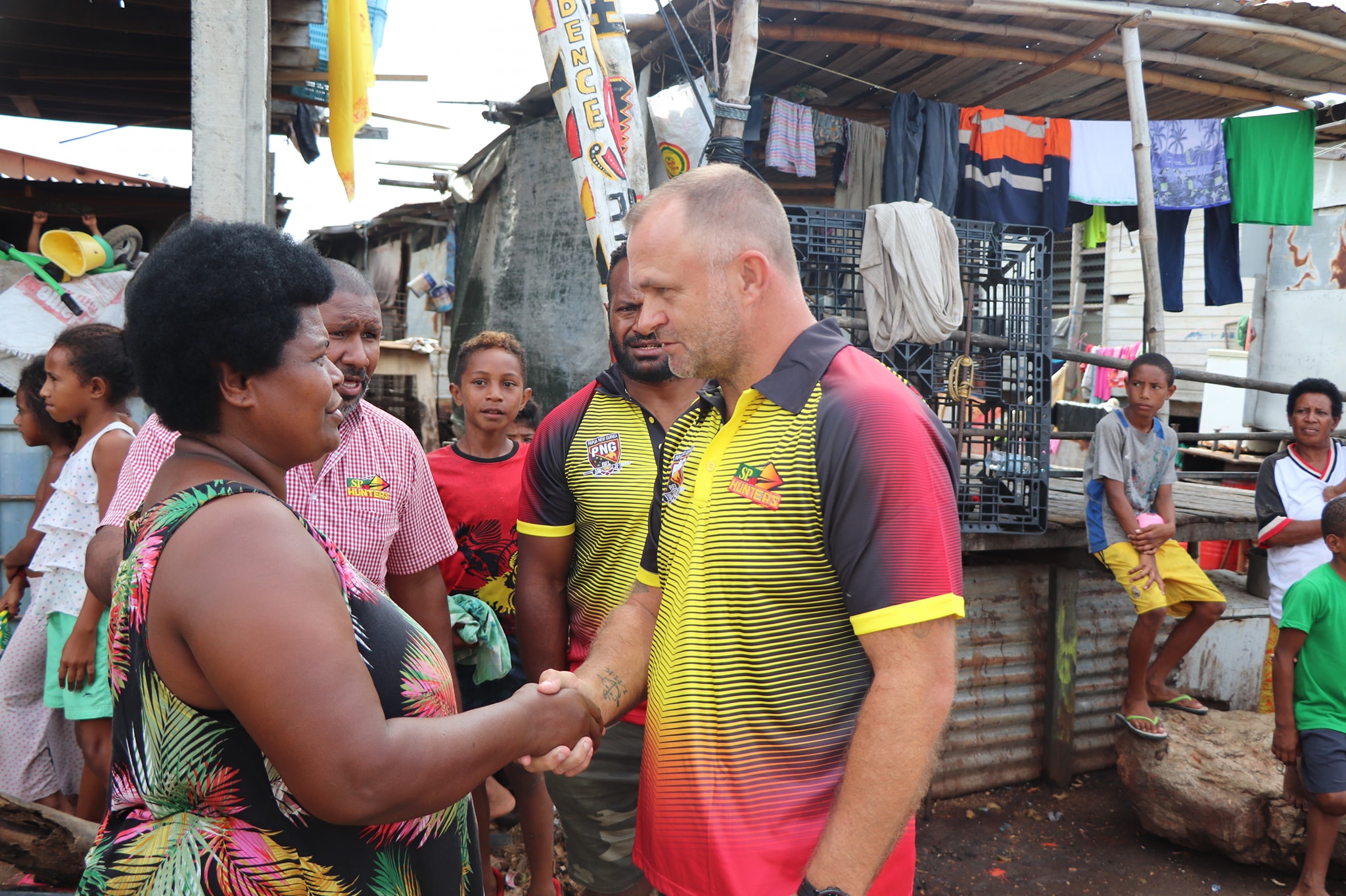 Feature Pic: Hunters Coach Matthew Church greeting Kato Ottio’s Mother Joyce Ottio, with Team Chaplain Arthur Tane